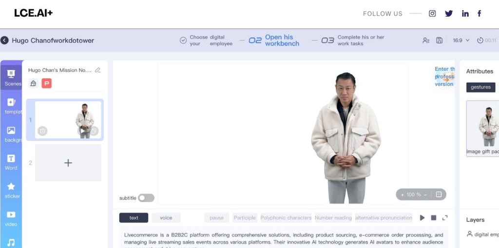 LCE.AI+ will then create livestream sessions with AI Avatars and connect it with our E-commerce engine to start livestreaming on social media platforms