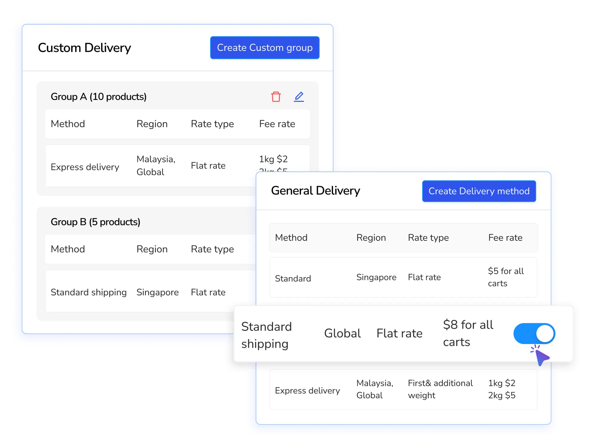 - Sell domestically and cross-border with multiple customisable delivery methods. Create local delivery, international shipping and self-collection options.